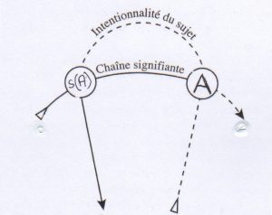 Nel piano superiore, si ritrova anche una linea intermedia corrispondente a quella metonimica del piano inferiore, che ai due estremi ha l’algoritmo del fantasma, S (soggetto) barrato punzone a, da una parte e la “d” del desiderio, dall’altra, in corrispondenza del “je” e di “(i)a” sulla linea intermedia del piano inferiore.