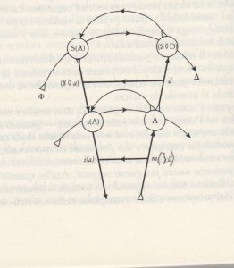 Così al luogo del messaggio, s(A) sul piano inferiore corrisponde in alto un S (significante) di A barrato, vale a dire che pure l’Altro è assoggettato alla legge del significante, così pure, al posto del grande Altro, tesoro dei significanti in basso, corrisponde in alto un S (Soggetto) barrato punzone D, vale a dire il luogo dei significanti pulsionali, che è anche la formula della pulsione.