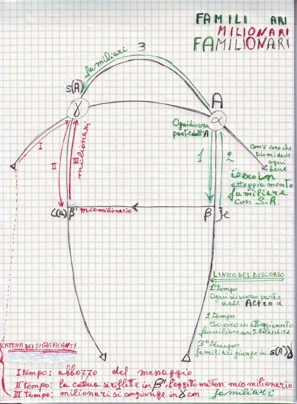 Contemporaneamente, ci dice Lacan, avviene qualcosa sulla linea dei significanti, che qui è disegnata in rosso. Nel primo tempo c’è solo un abbozzo del messaggio. Da dove viene quest’abbozzo del messaggio? Evidentemente questo messaggio è preparato, come ho detto, nel rapporto che si era stabilito tra il poeta Hein e Hirsch-Hyacinth, dall’atmosfera che si era creata, di tutti quei significanti che erano già all’opera, legati al denaro; tutto era già nell’intesa che si era stabilita tra i due: nel racconto del suo rapporto con Nathan il Grande e di questo con i Re, si comincia a creare l’aura del denaro molto abbondante, della grande quantità di denaro. Con l’aiuto topologico di questo grafo Lacan illustra che nella parte sinistra del grafo, correlativo al secondo tempo della parte destra, c’è un secondo tempo discendente dove è trovato l’oggetto metonimico, nella linea del “mio milionario”. Qui in b’ (beta 1) è pescata la parola, “milionari”, elemento che torna indietro col vettore qui in rosso e va, verso il messaggio in g, nel terzo tempo, correlativo al terzo tempo di “familiari”, che dal grande Altro in a scende verso il messaggio in g. Qui abbiamo finalmente la composizione metaforica del messaggio con la sovrapposizione di queste due parole, “familiari” e “milionari”, dalla cui scomposizione e ricomposizione si ottiene la costruzione del motto di spirito.
